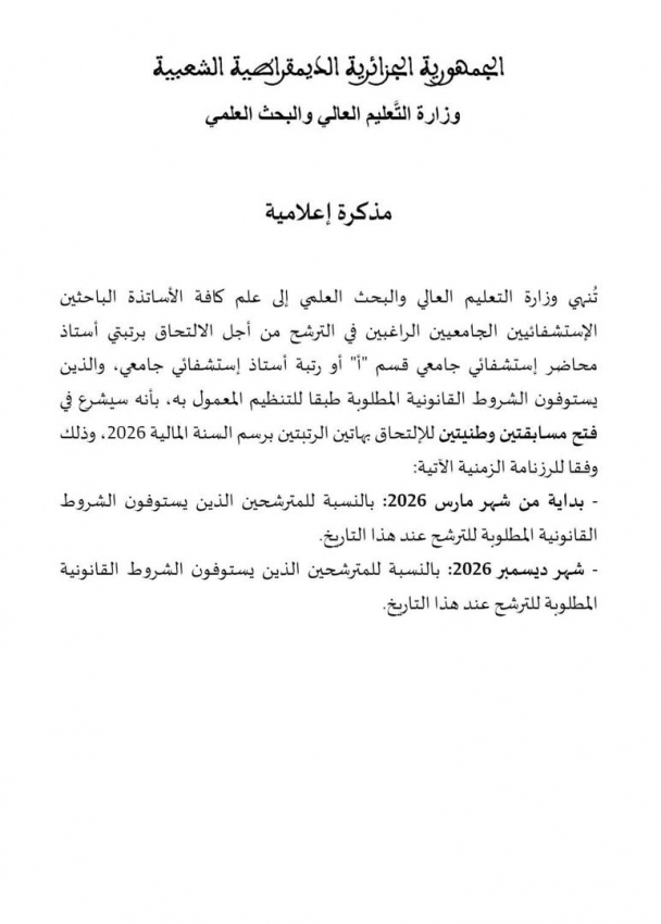 تمديد فترة إيداع ملفات المسابقة على أساس الاختبار للإلتحاق برتبة أستاذ