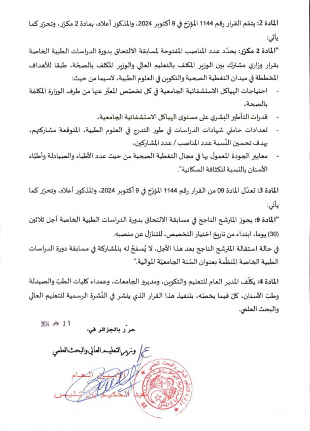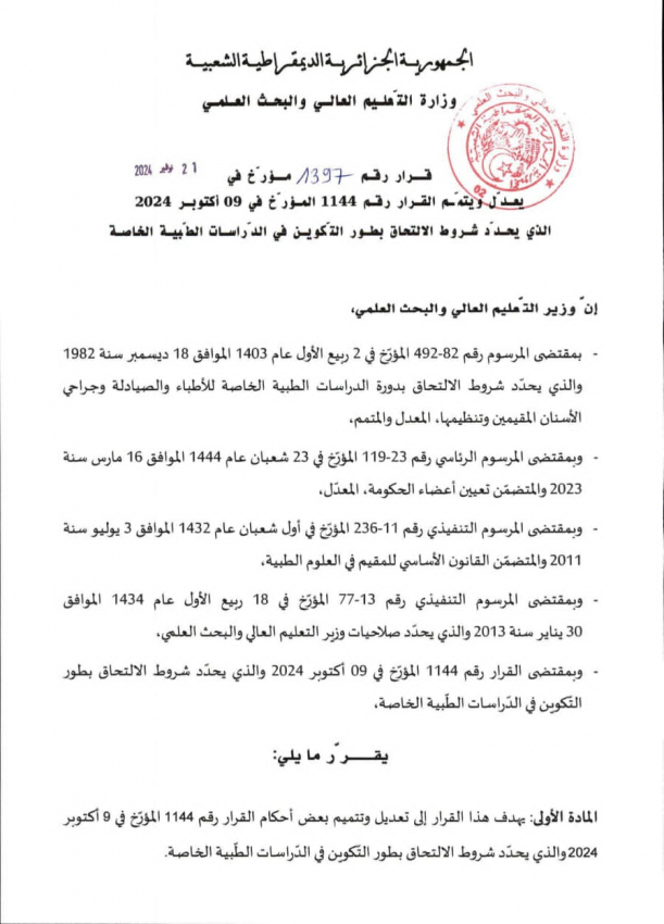 للإعلام وبدون نشر في مواقع التواصل الاجتماعي قرار رقم 1397 مؤرخ في 21 نوفمبر 2024 يعدل ويتم القرار رقم 1144 المؤرخ في 09 أكتوبر 2024 الذي يحدد شروط الإلتحاق بطور التكوين في الدراسات الطبية الخاصة
