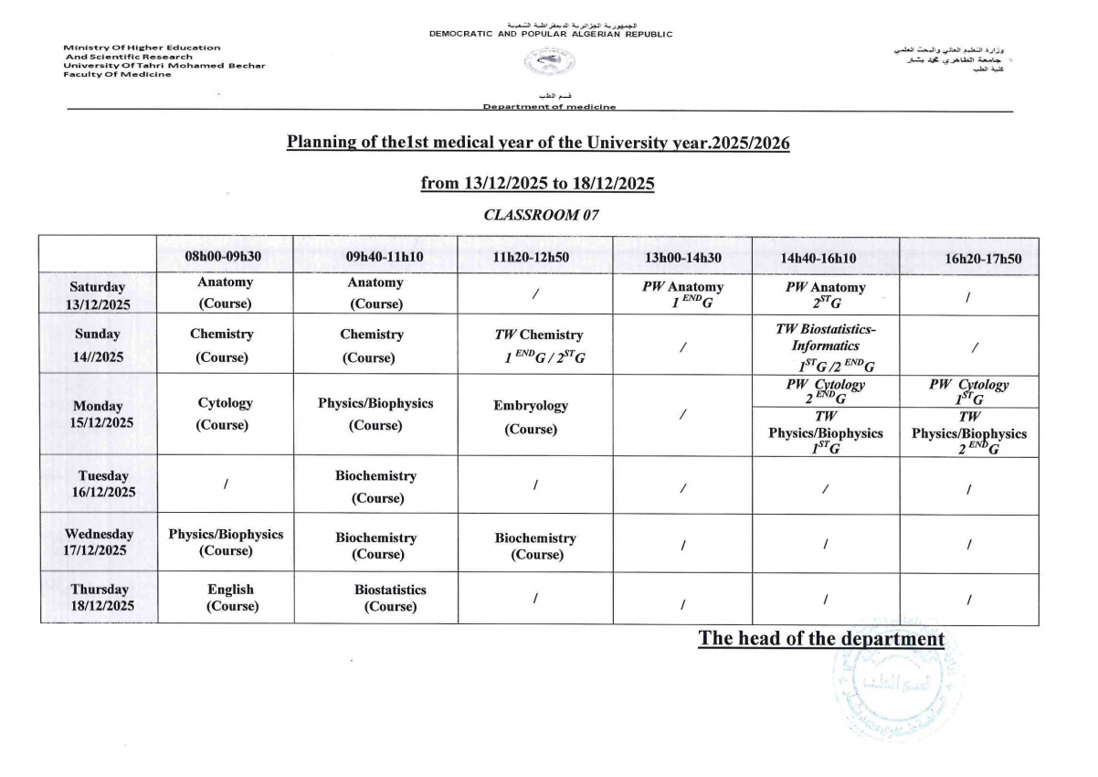 إستعمال الزمن سنة أولى طب